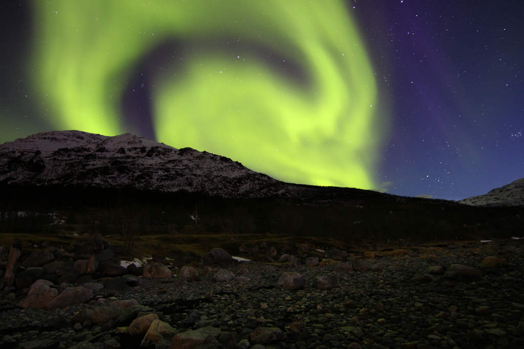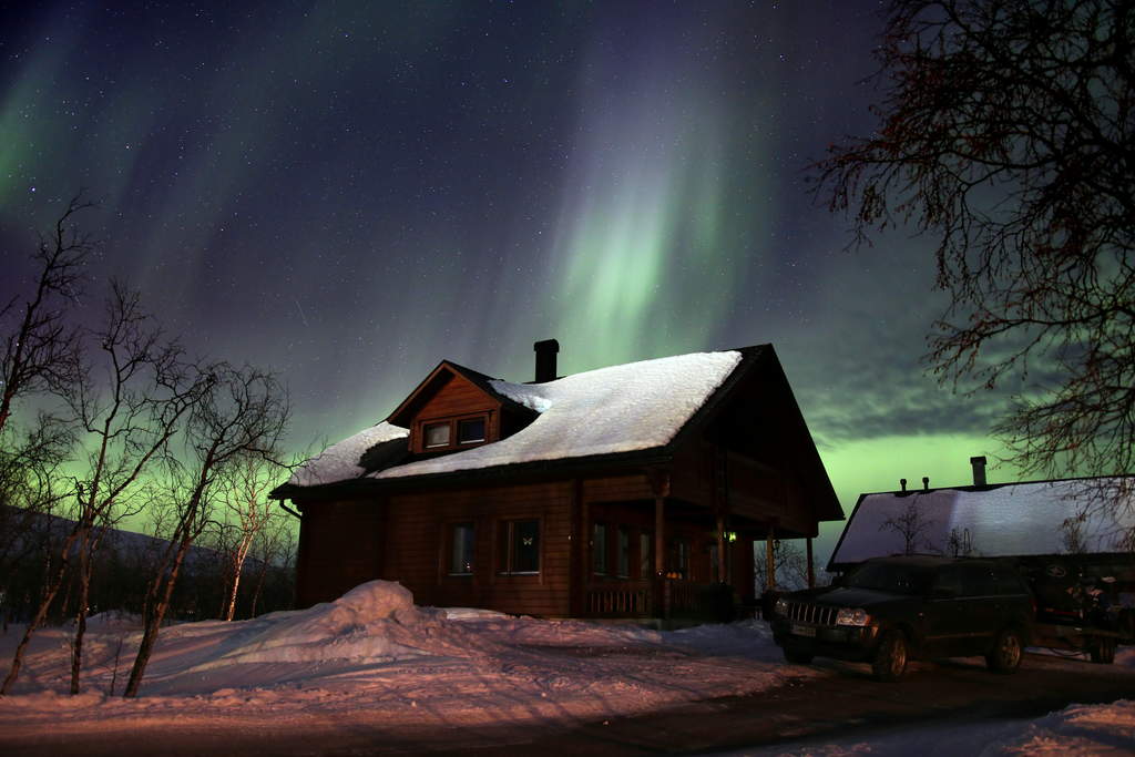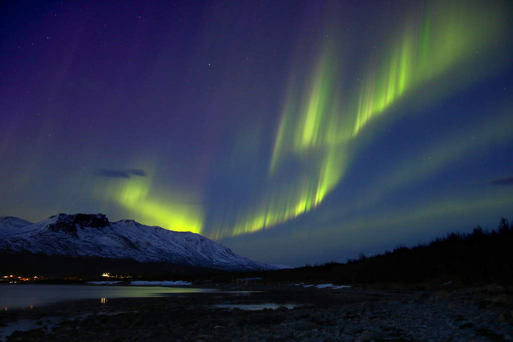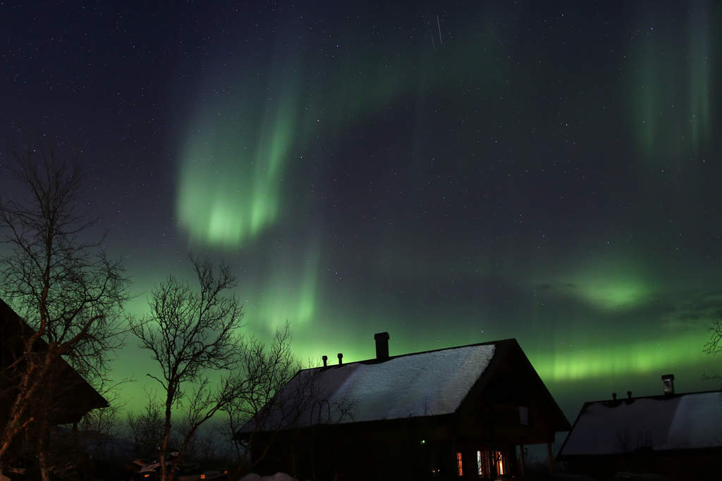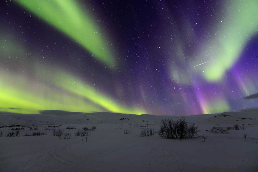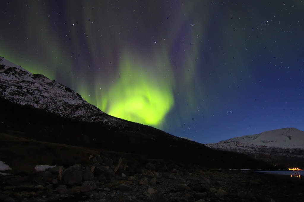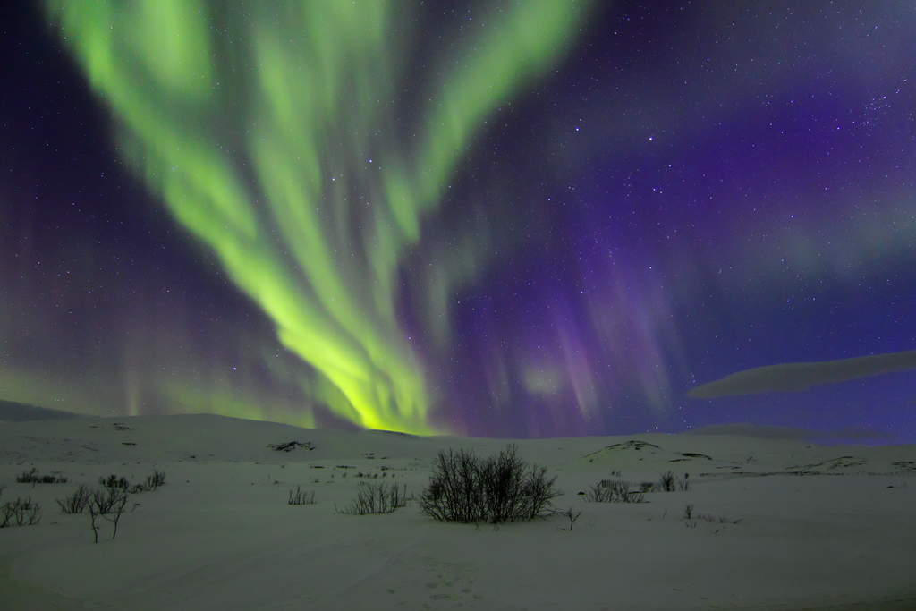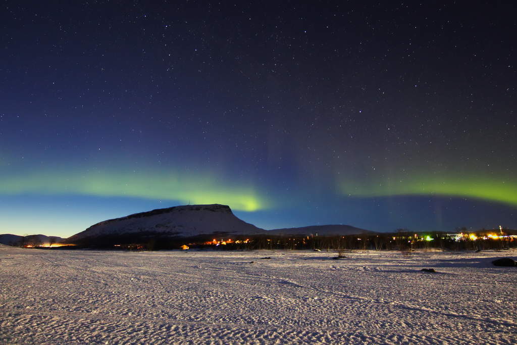 The show starts late in the evening, observed from frozen Lake Kilpisjärvi. |