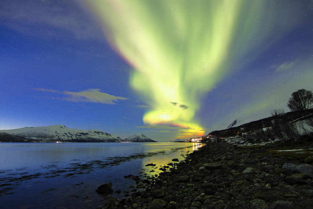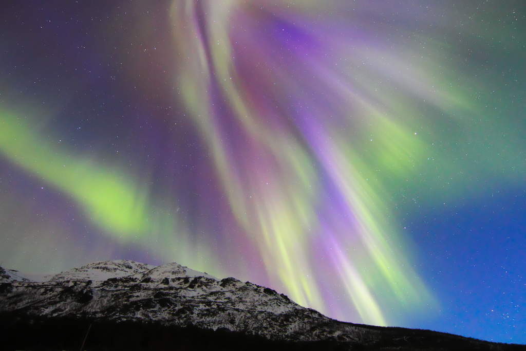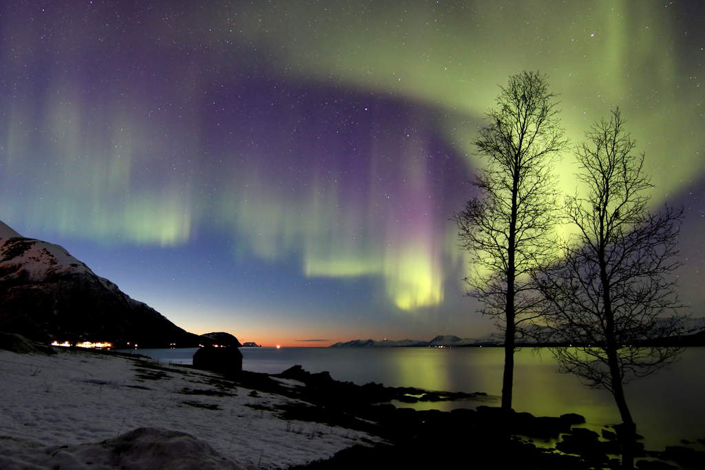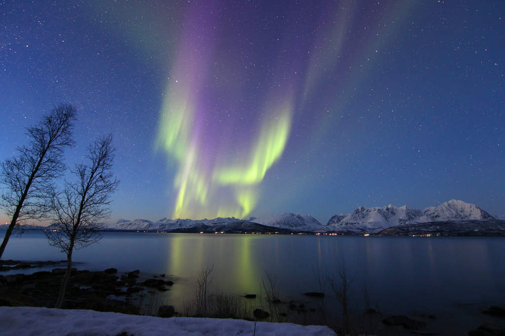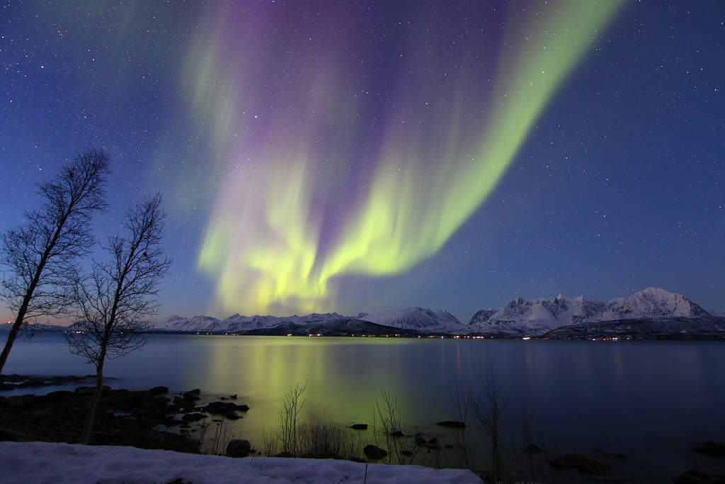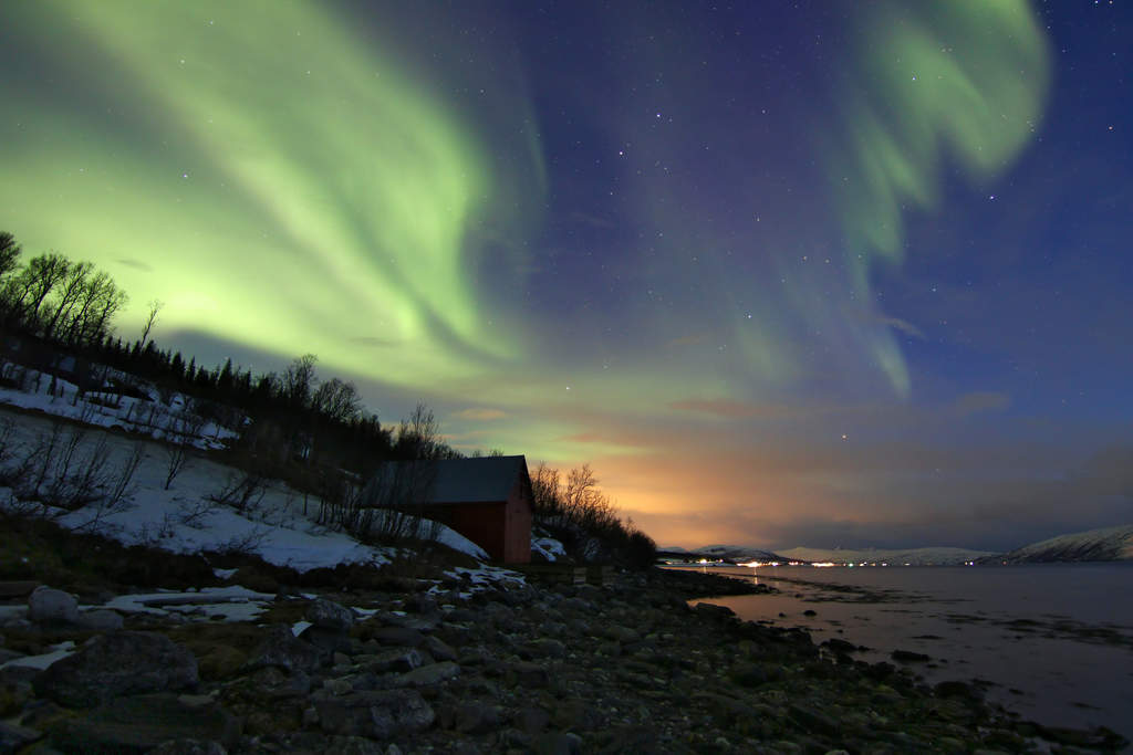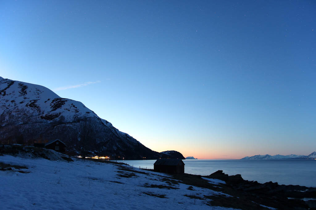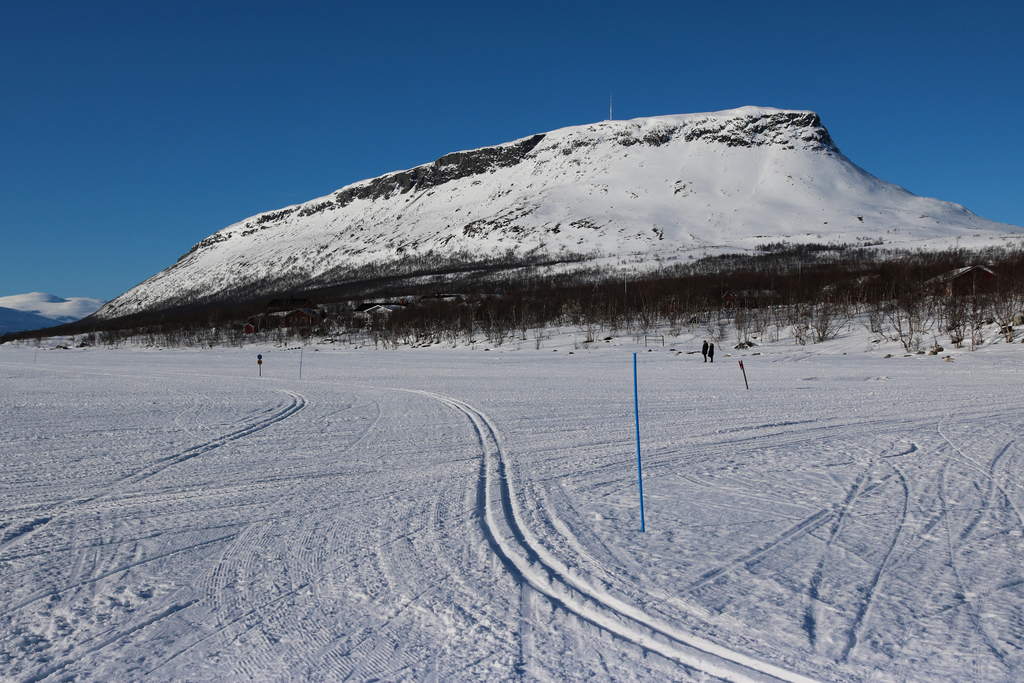 The show starts late in the evening, observed from frozen Lake Kilpisjärvi. |